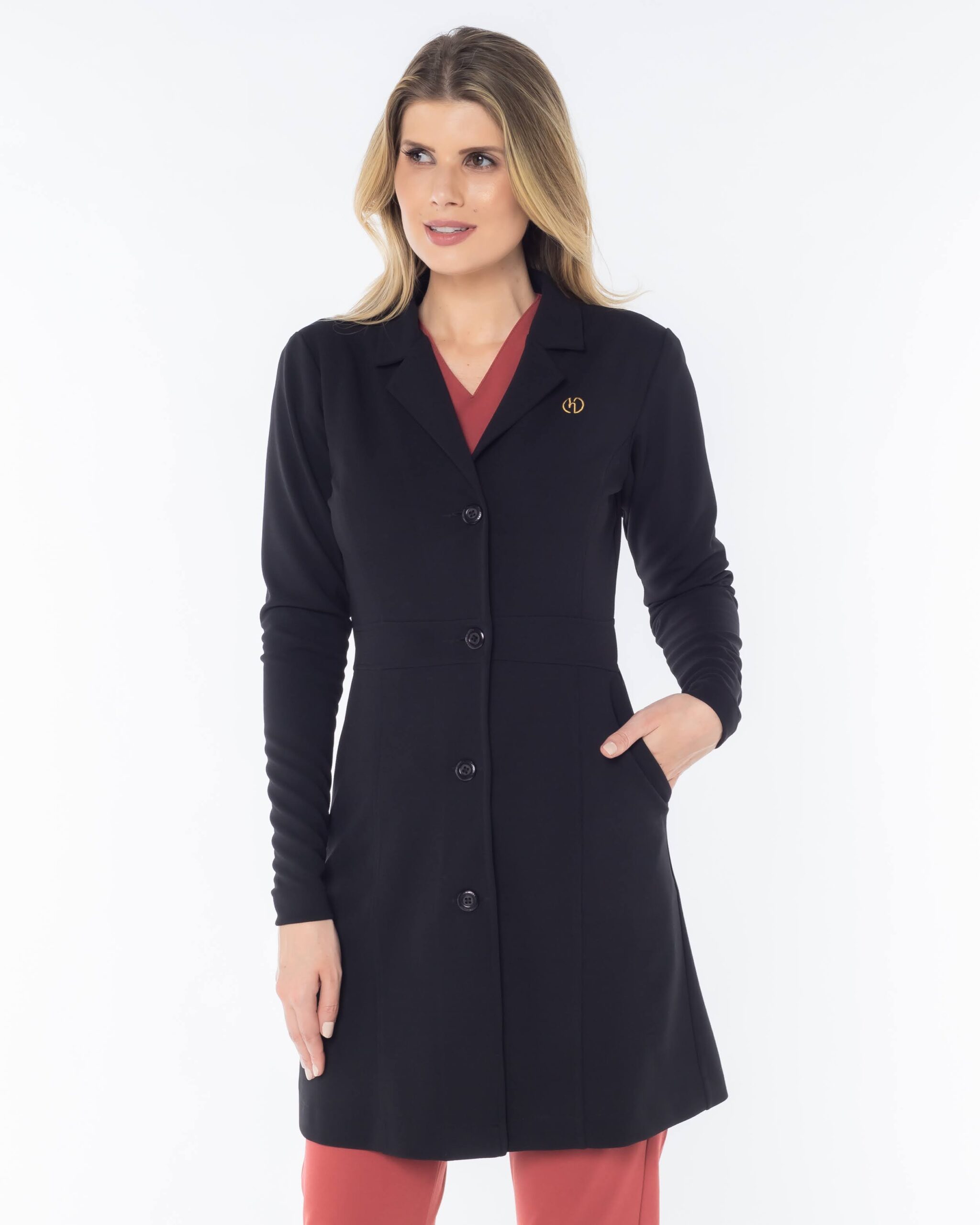 Jaleco feminino barcelona, feito com tecido elastano. É um jaleco elegante, com modelagem acinturada, permitindo um caimento perfeito.