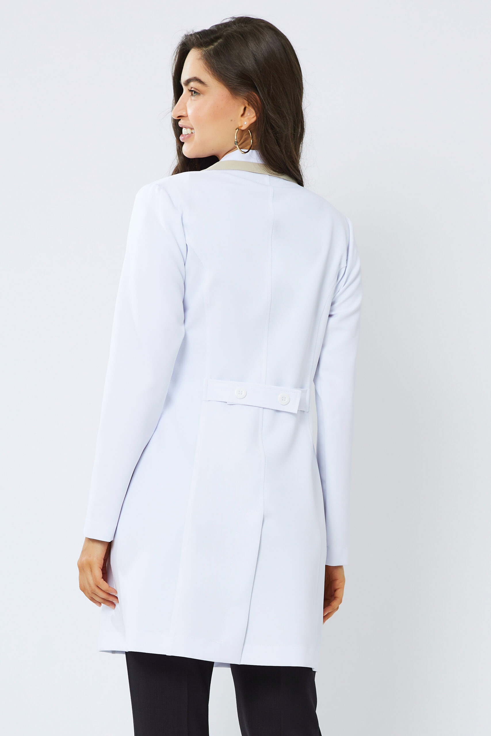 Feito no tecido alfaiataria, dando elegância e conforto. Com um acabamento perfeito, fechamento com botões e bolsos na parte inferior frontal. Gola com duas cores, dando um destaque a mais.