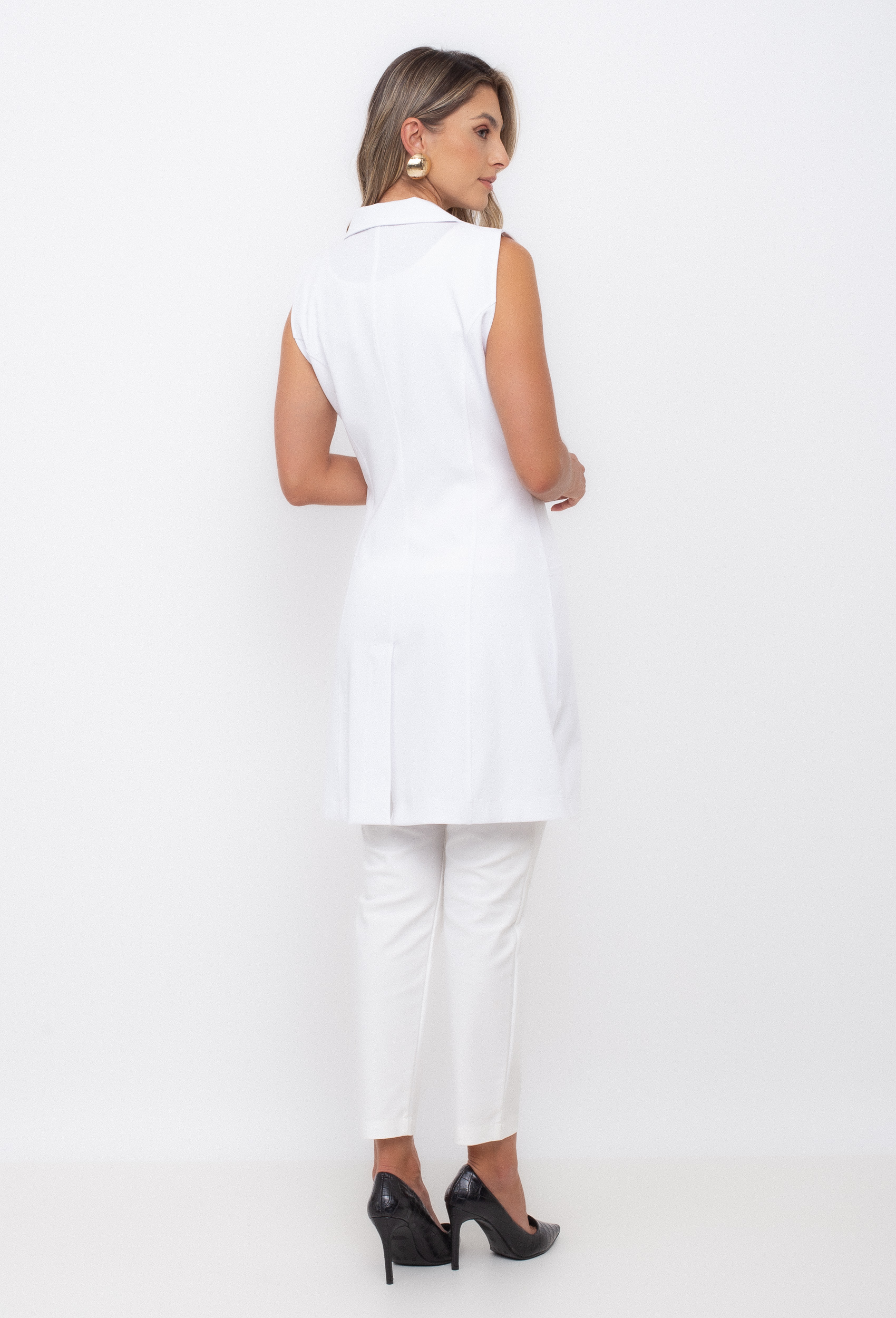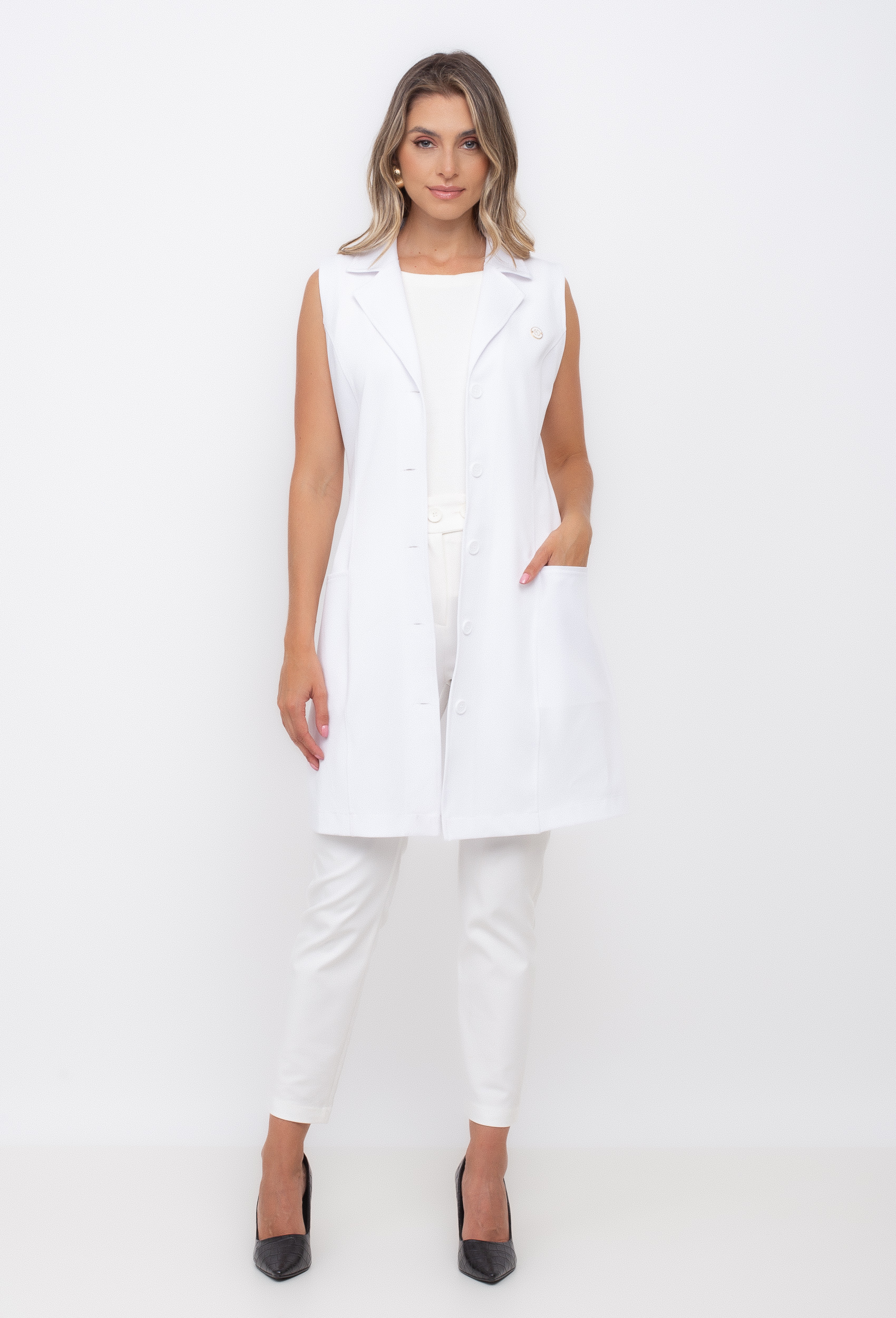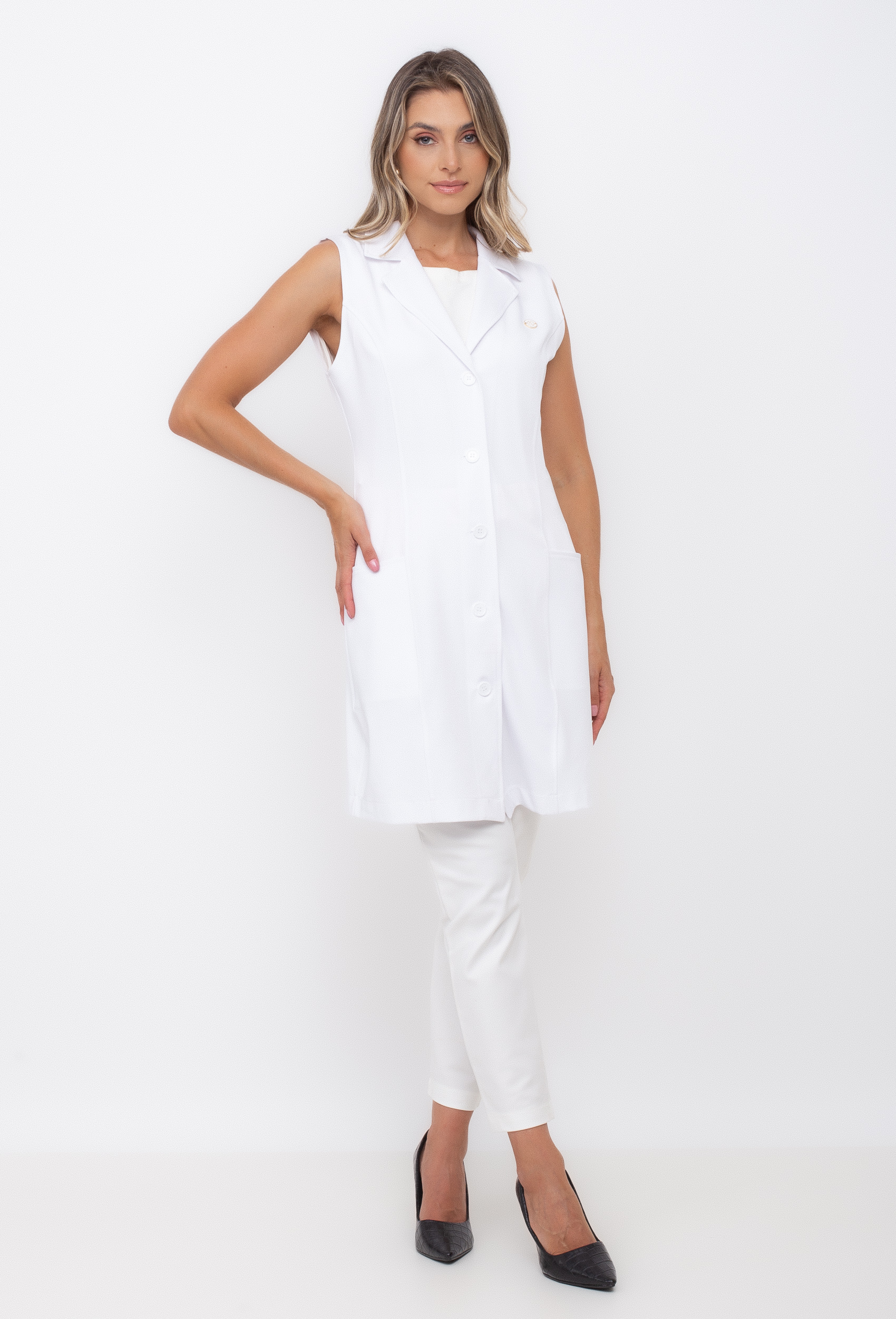 Jaleco sem manga confeccionado com um tecido leve e confortável, tendo em sua composição 95% poliéster e 5% elastano.