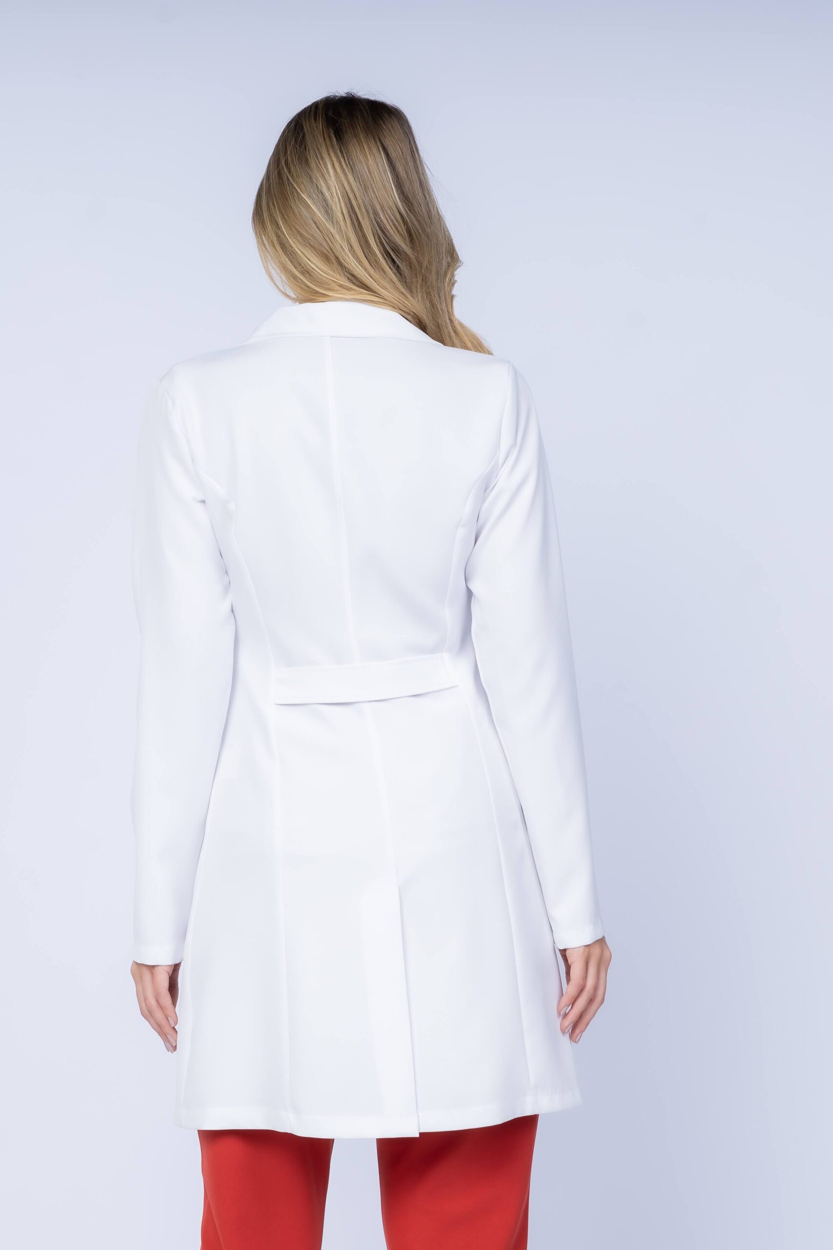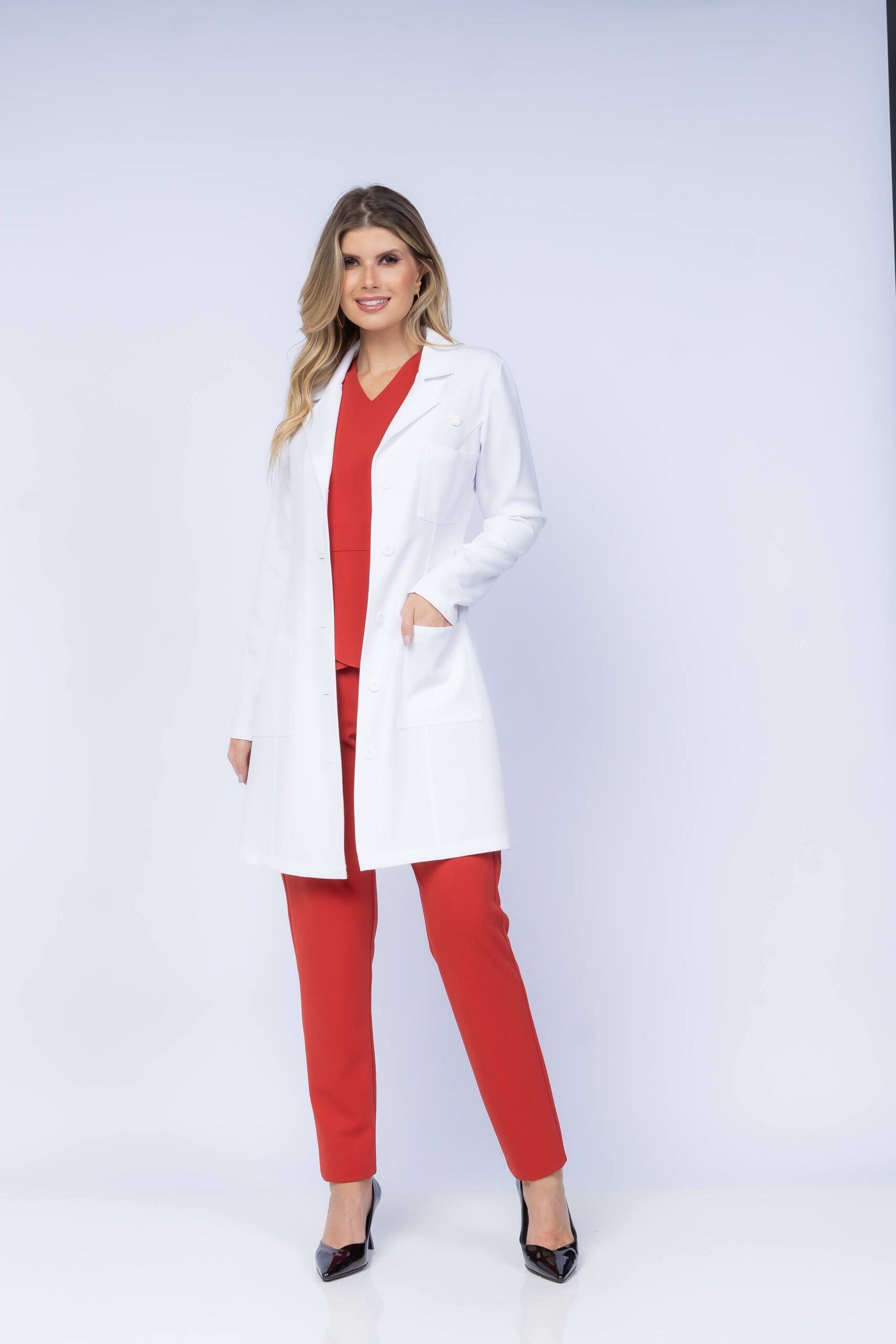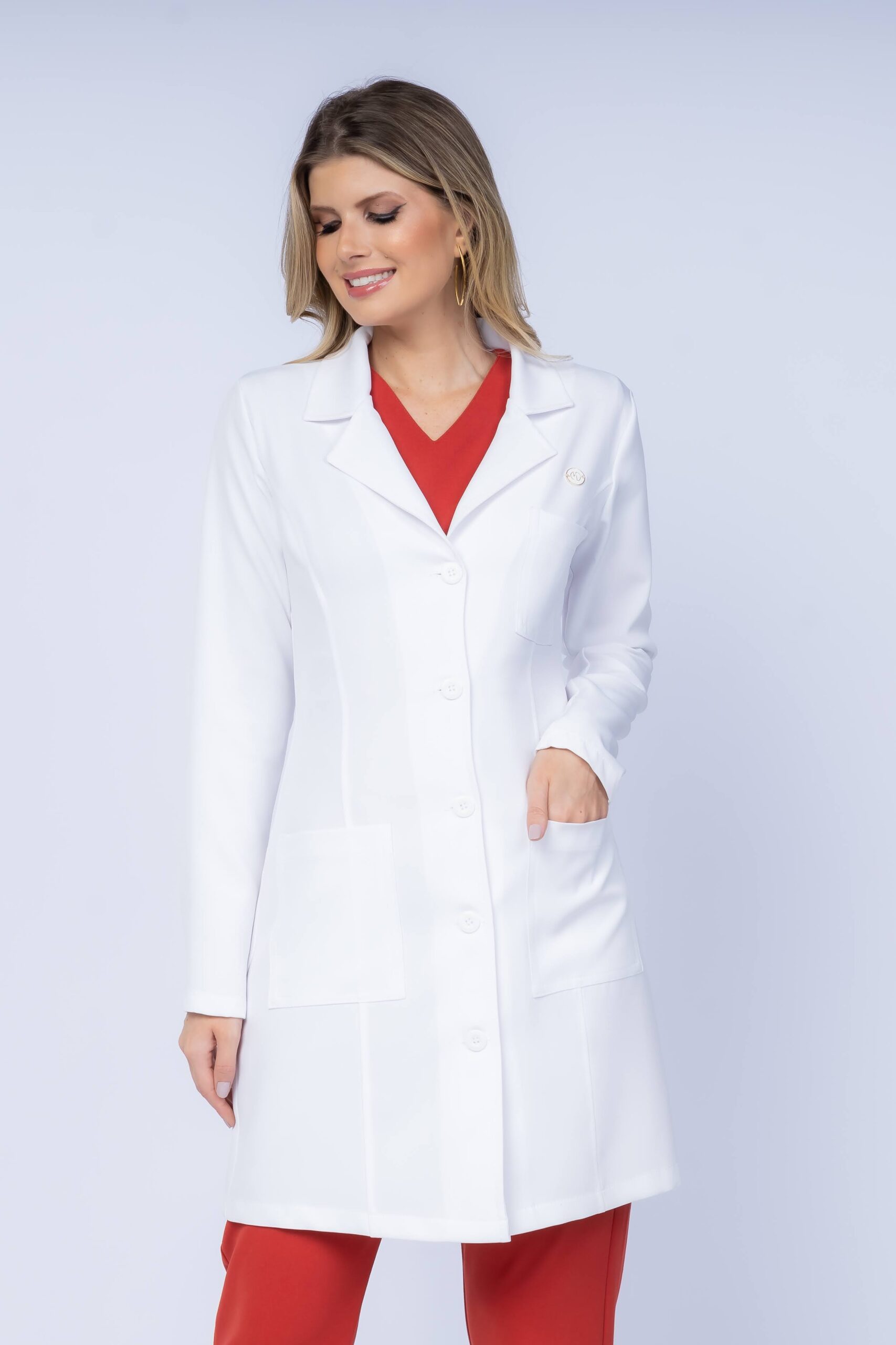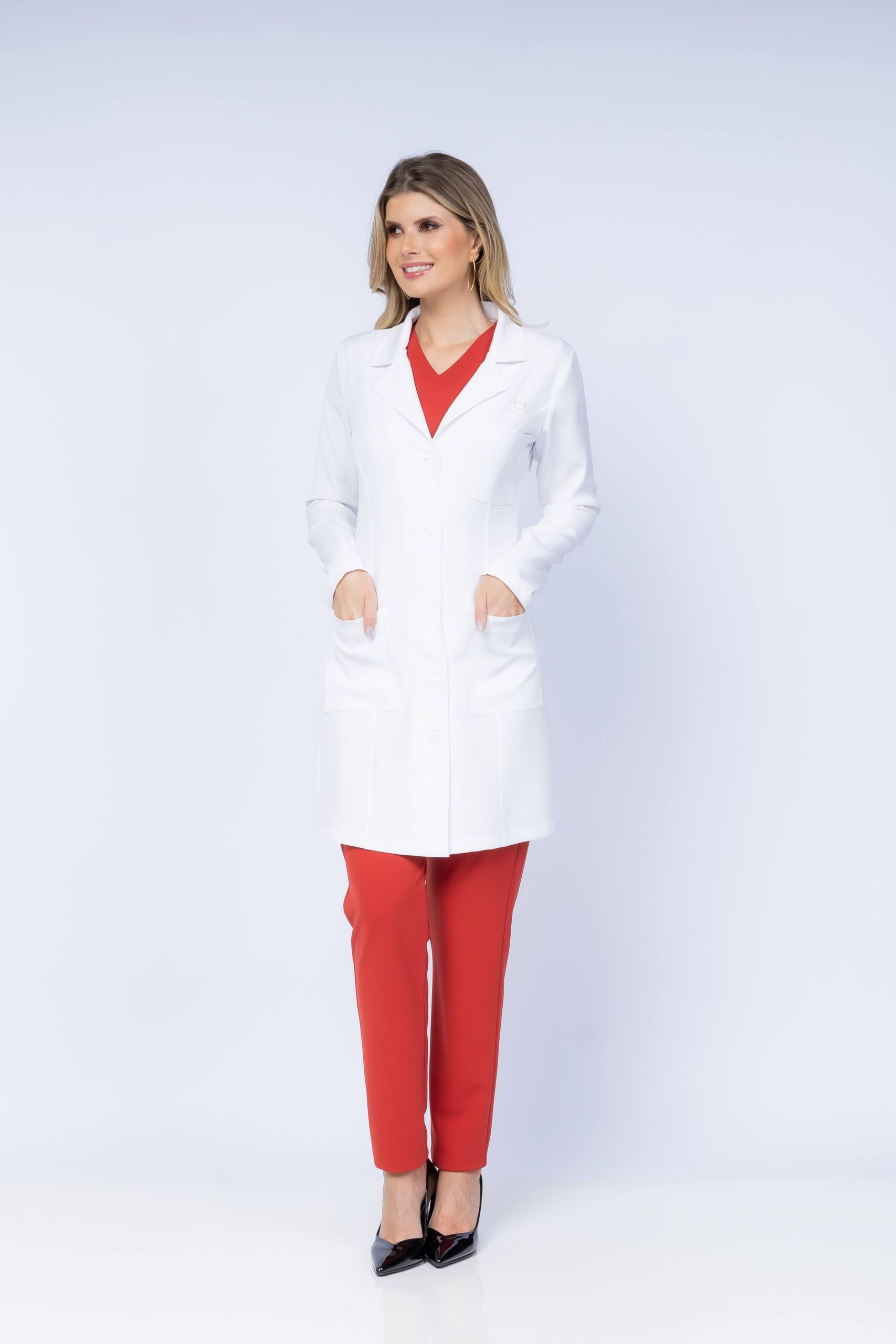 Jaleco moderno, confeccionado em tecido 100% poliéster, com fechamento em cinco botões frontais e possui bolsos embutidos.
