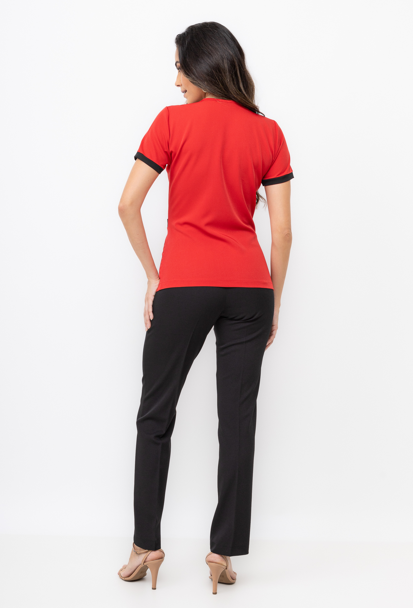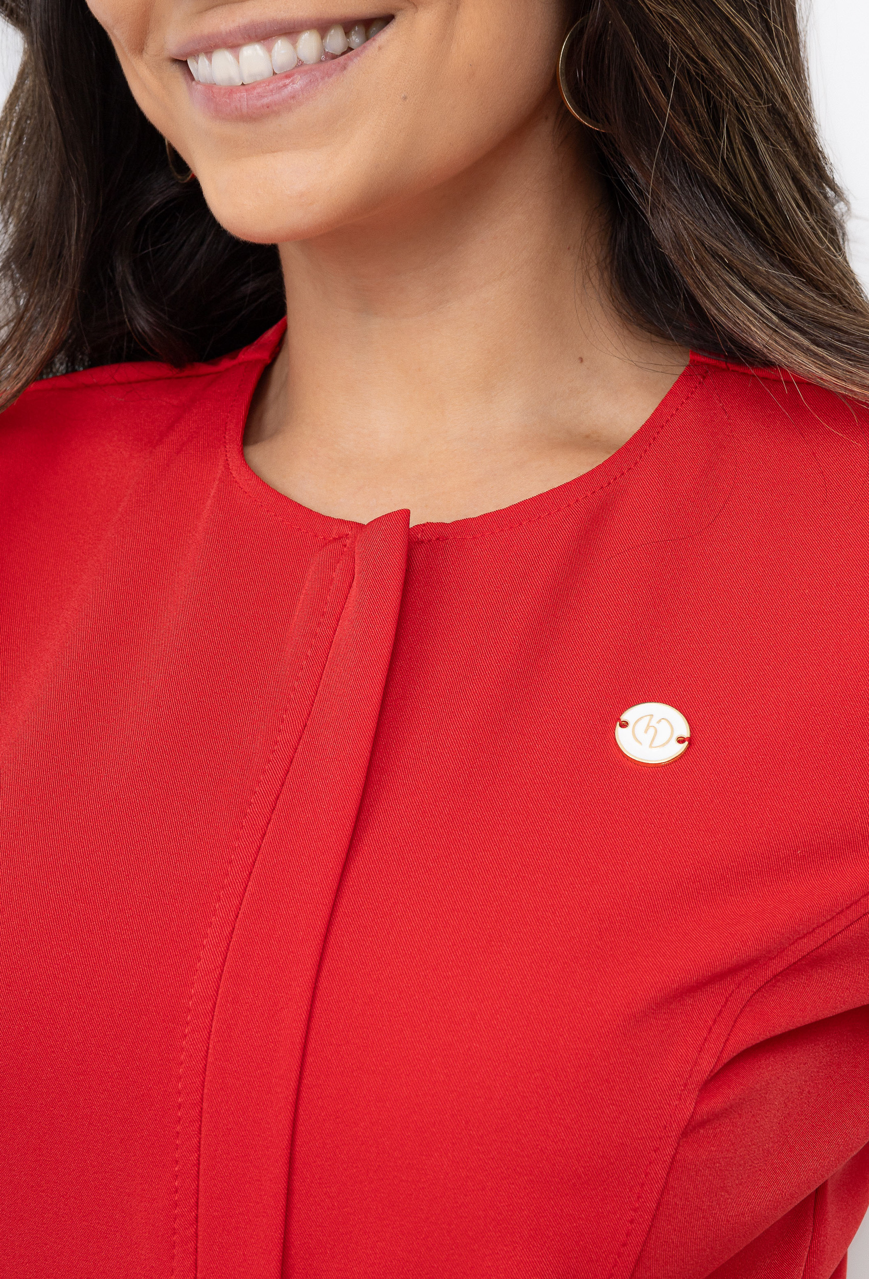 Já a parte de baixo é uma calça social, possuindo um bolso de cada lado na parte da frente.