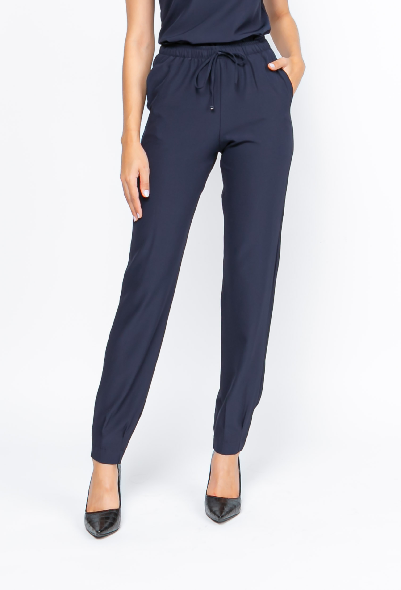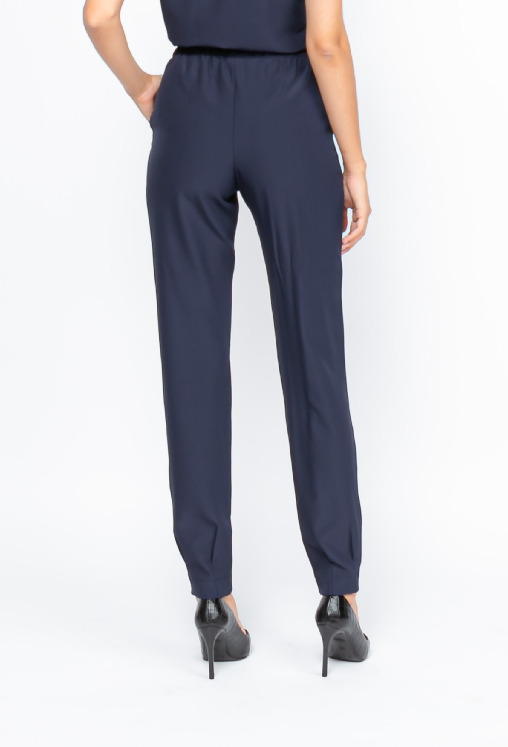 Já a calça com corte reto, elástico na cintura com cordão facilitando o ajuste na cintura com bolsos nas laterais, e a barra da calça mais ajustada com duas pregas que dá todo o charme.