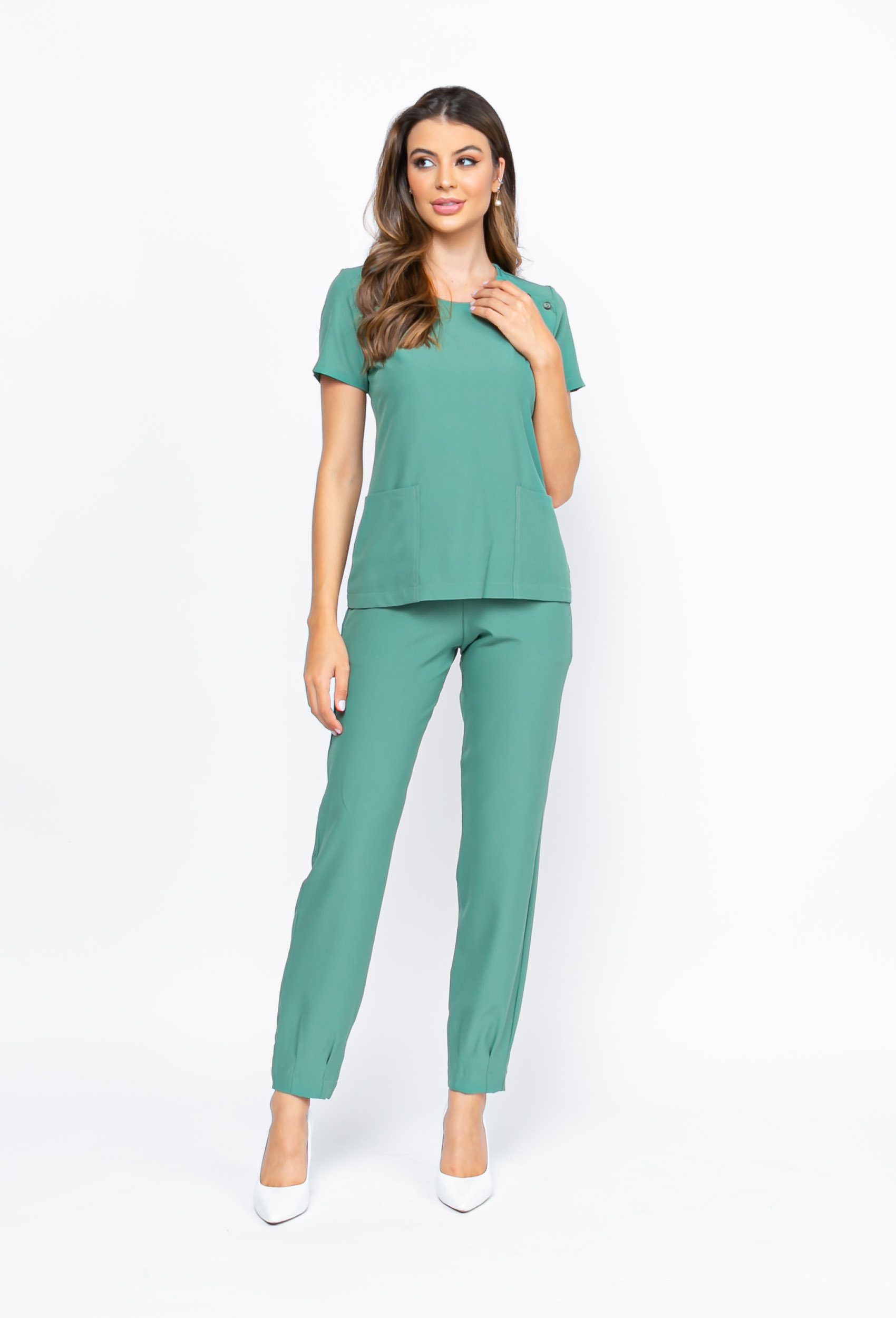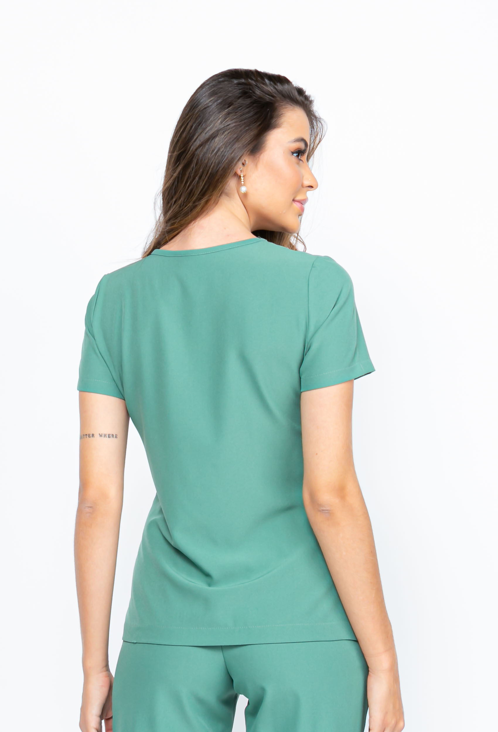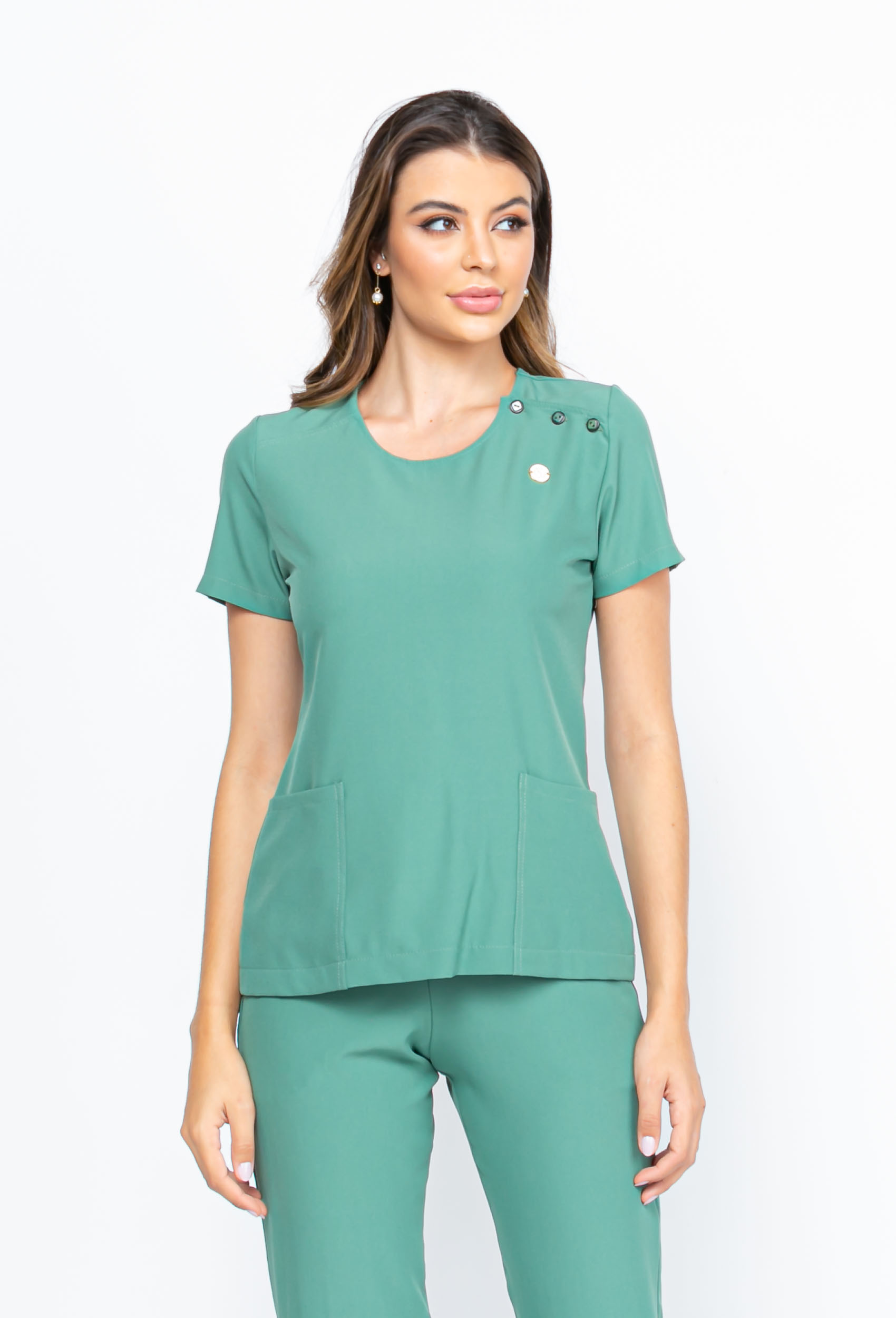 A blusa do nosso modelo scrub crep new luanda, possui 3 botões na gola redonda, facilitando a vestimenta, com dois bolsos quadrados na frente.