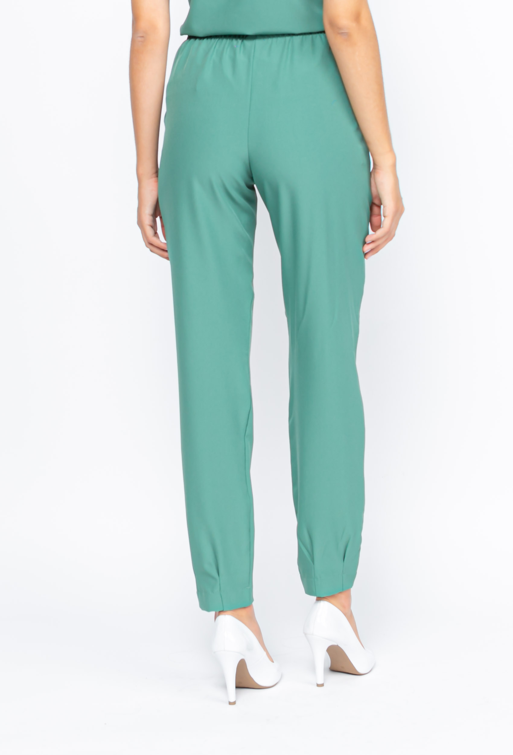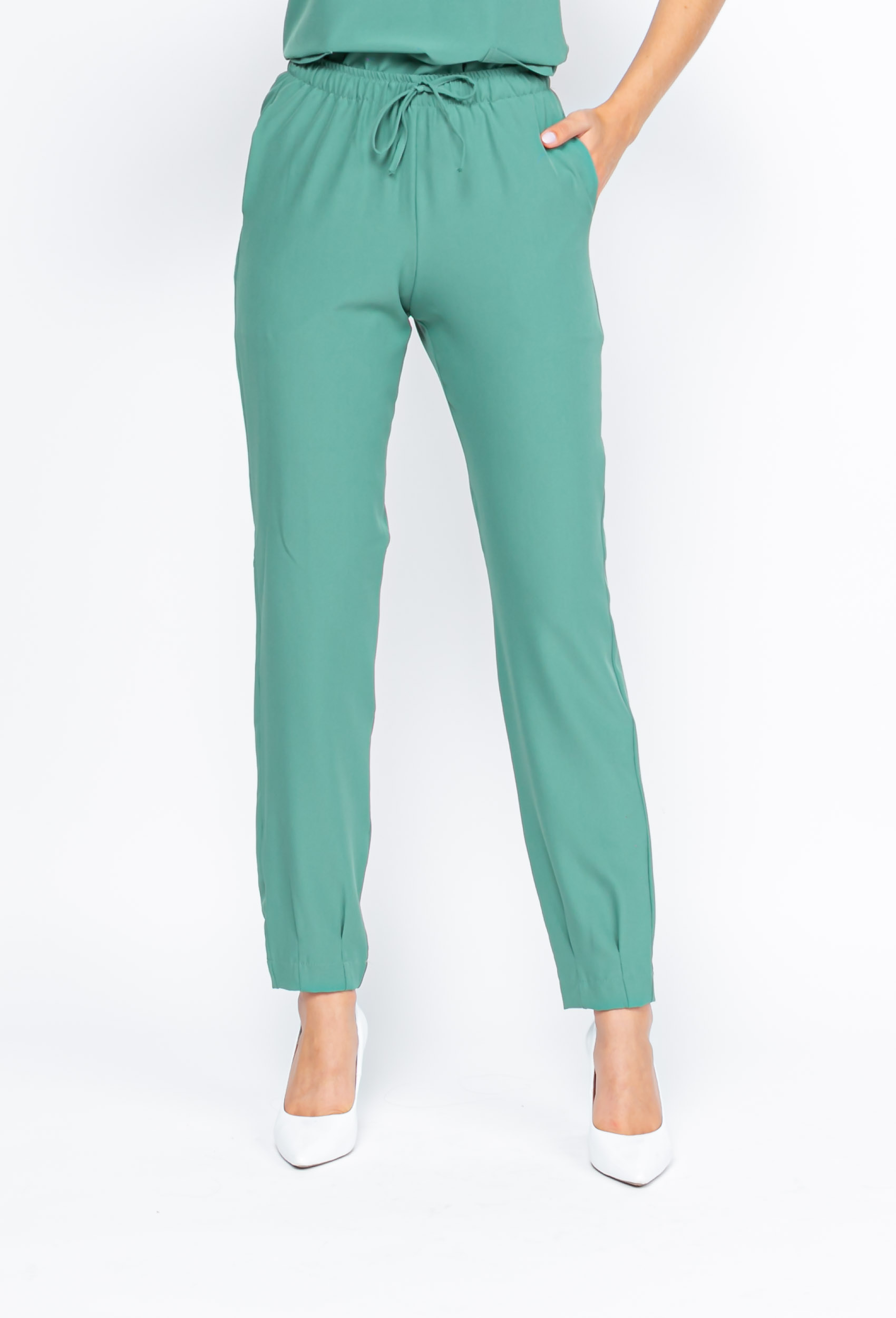 Já a calça com corte reto, elástico na cintura com cordão facilitando o ajuste na cintura com bolsos nas laterais, e a barra da calça mais ajustada com duas pregas que dá todo o charme.