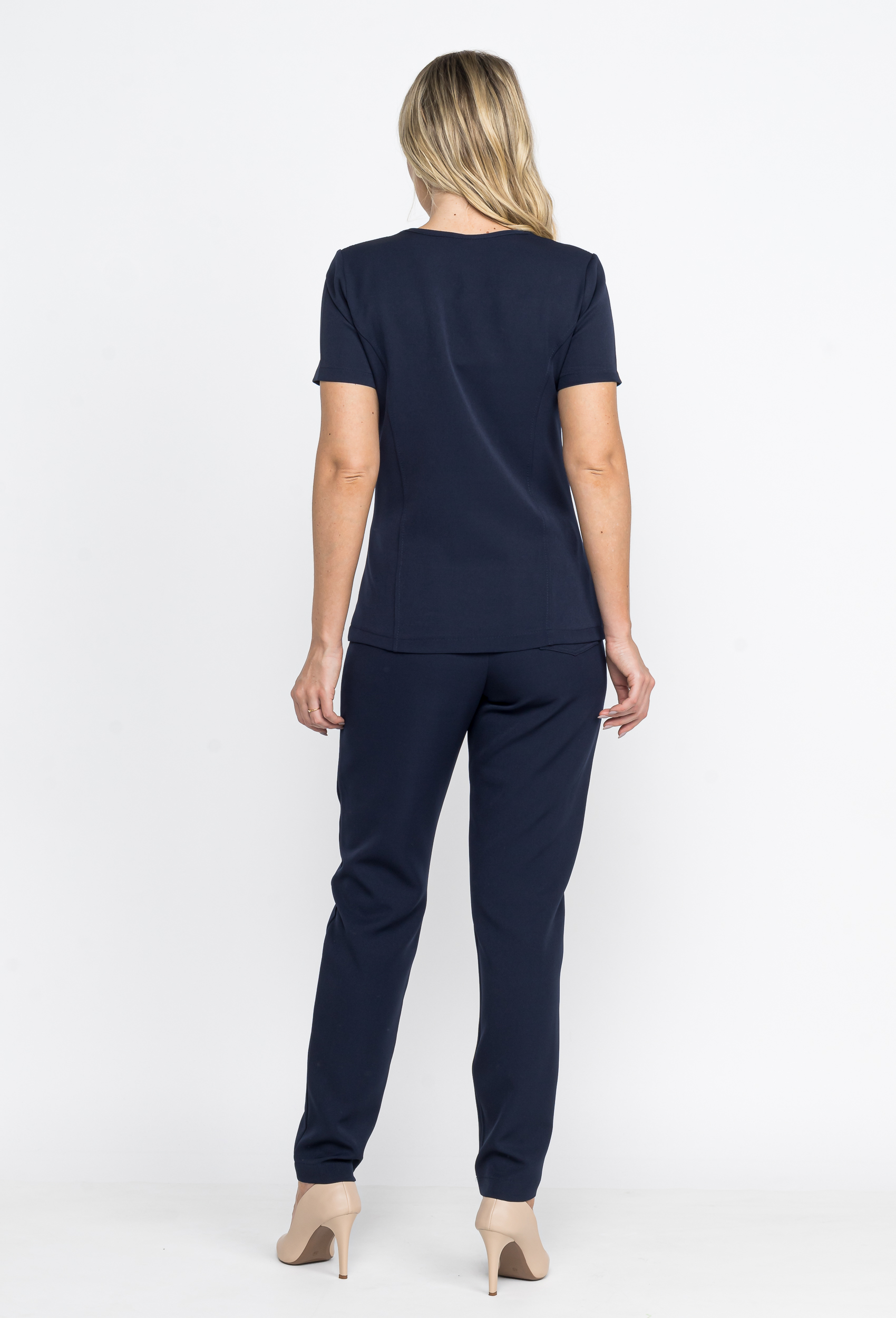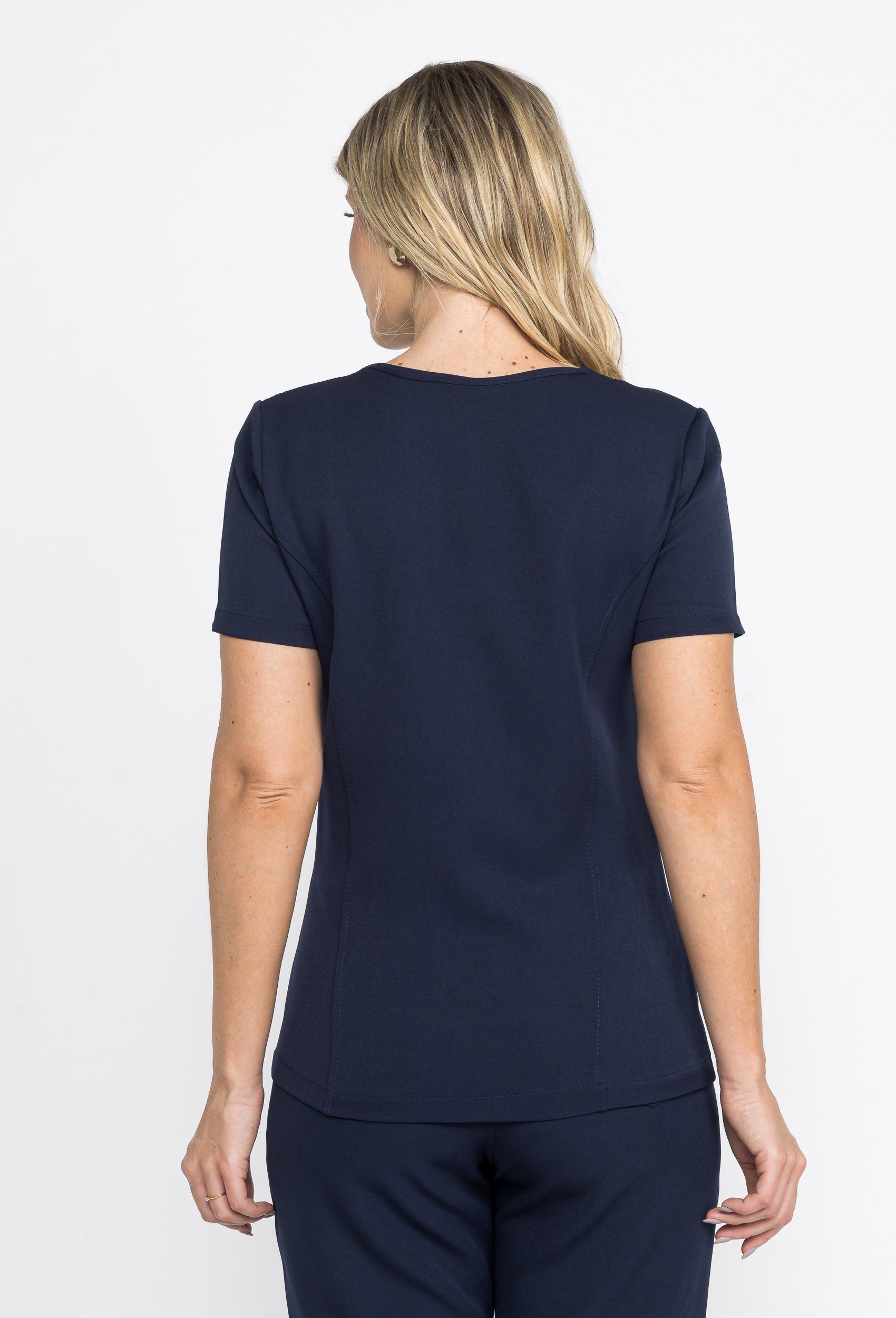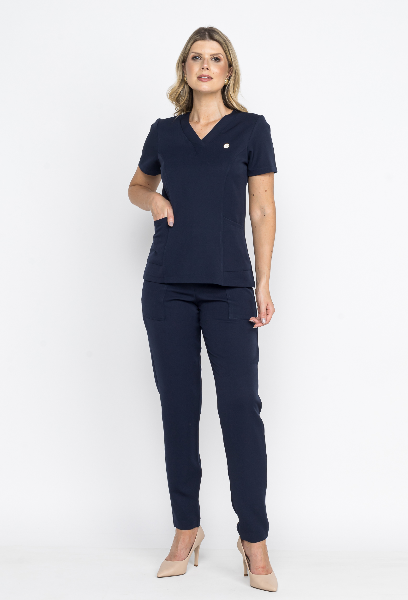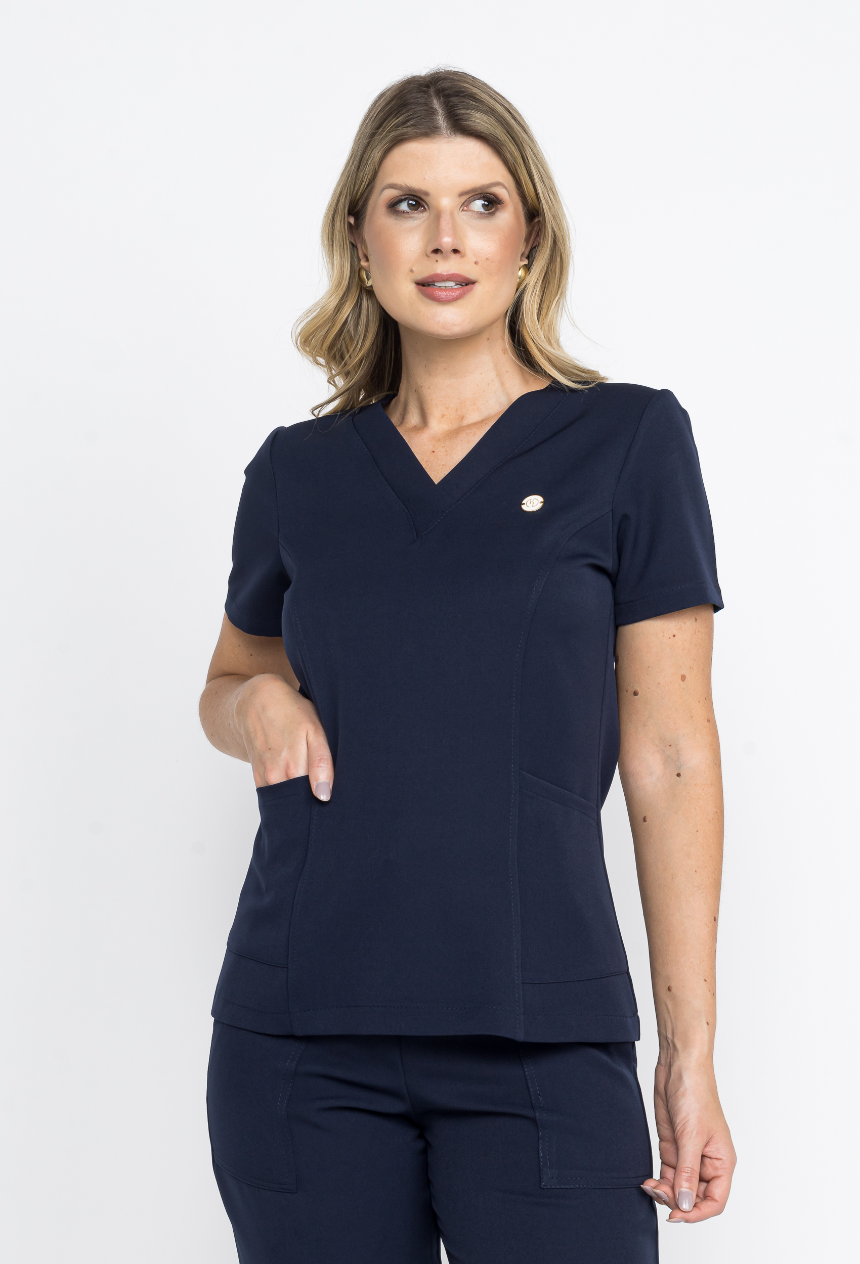 Sua blusa é um modelo bem básico, com a gola em v. Possui bolsos, e um recorte que deixa a blusa bem acinturada.
