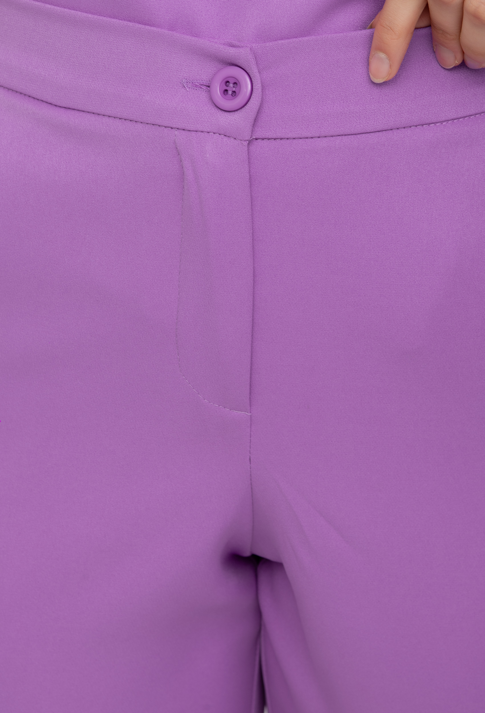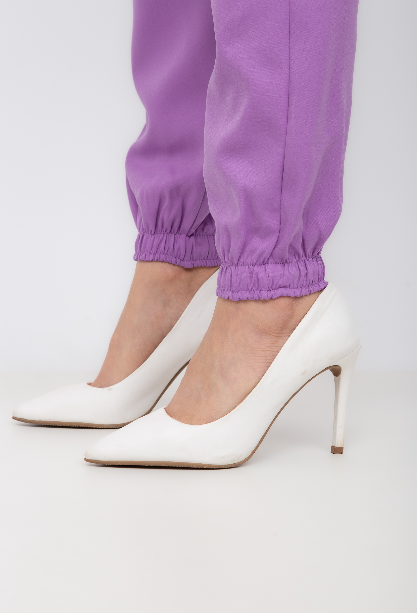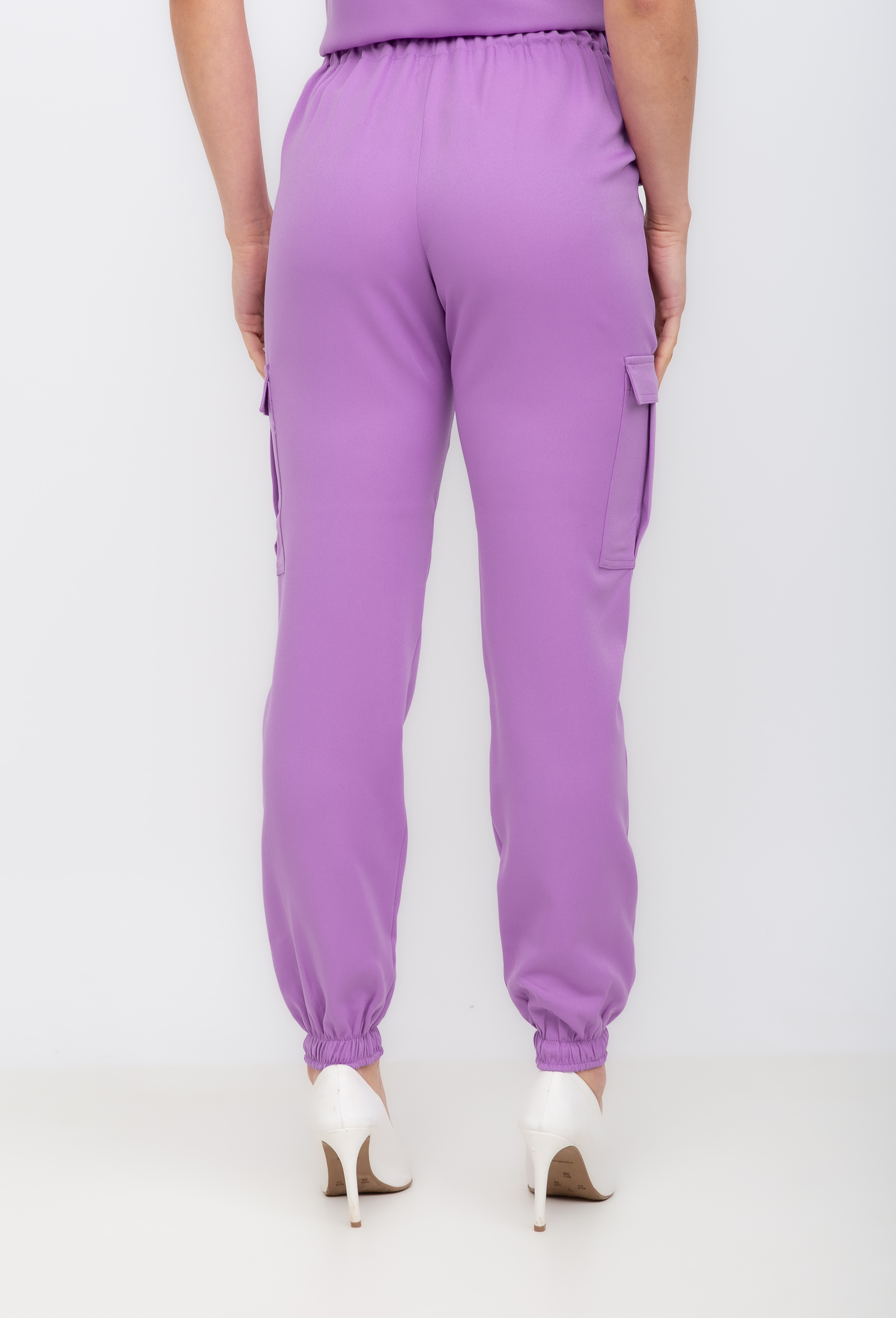 A calça possui cós com zíper na frente e elástico nas costas, deixando assim bem confortável. Nas laterais com bolsos e a barra com elástico.
