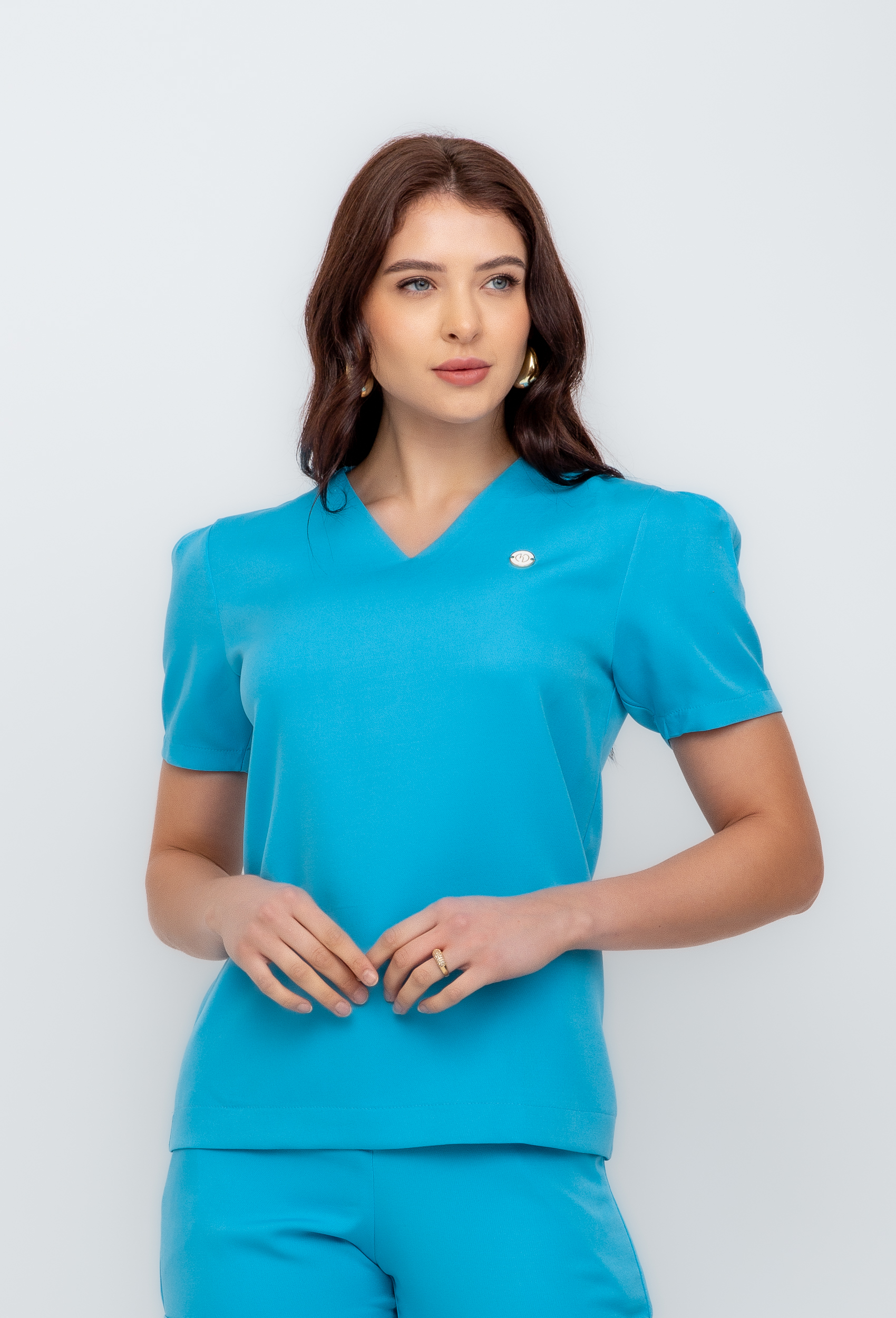 Scrub feminino barbie luxo, confeccionado no tecido barbie alfaiataria com composição de 95% poliéster e 5% elastano.