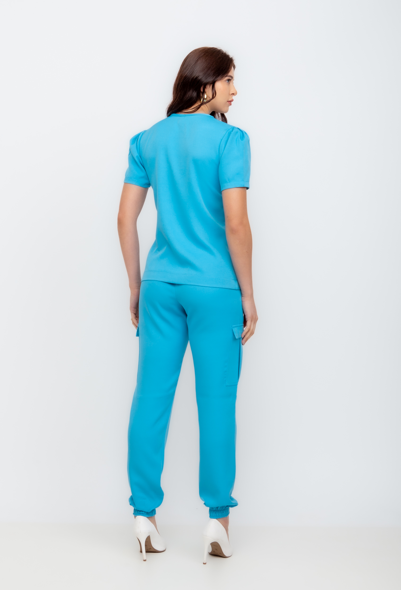 A blusa é um modelo tradicional com a gola v, e com um toque de estilo com as mangas um pouco franzidas.