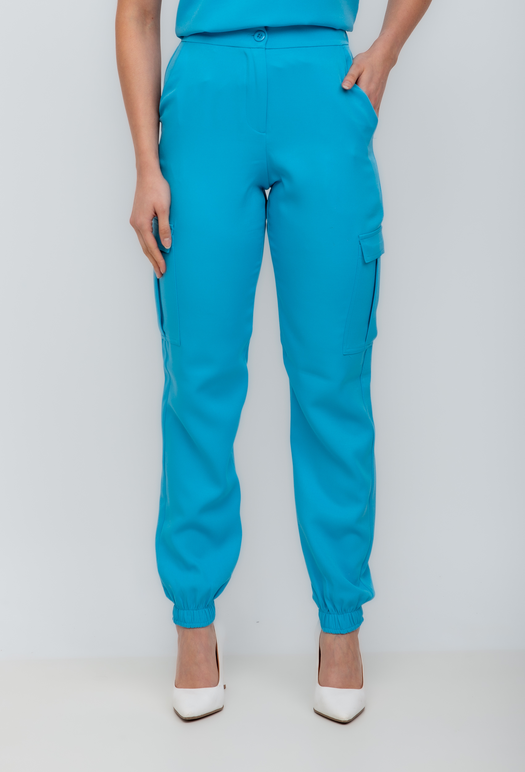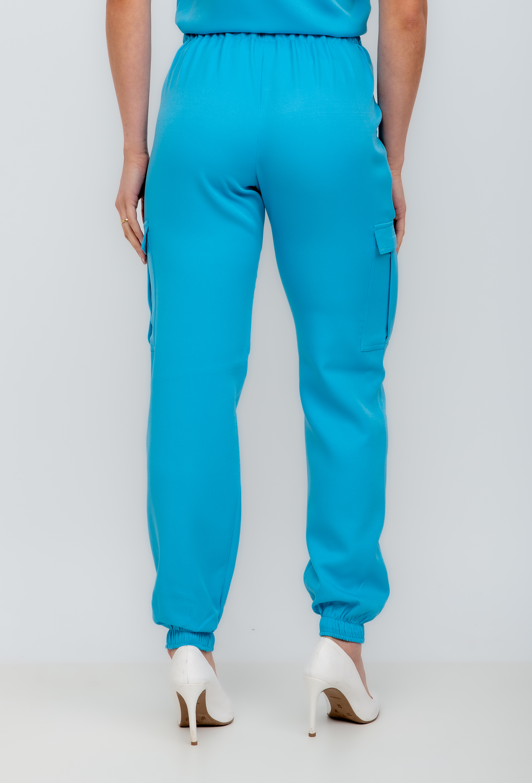 A calça possui cós com zíper na frente e elástico nas costas, deixando assim bem confortável. Nas laterais com bolsos e a barra com elástico.