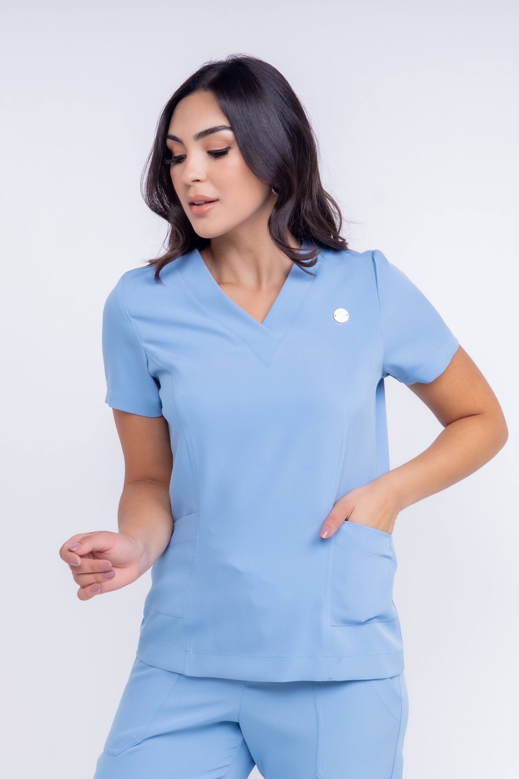 Scrub feminino feito no tecido alfaiataria, com 95% poliester e 5% elastano. Um modelo bem estiloso e moderno, confortável e com um caimento acinturado no corpo. É um scrub de fácil lavagem, longa durabilidade e não amassa com facilidade.