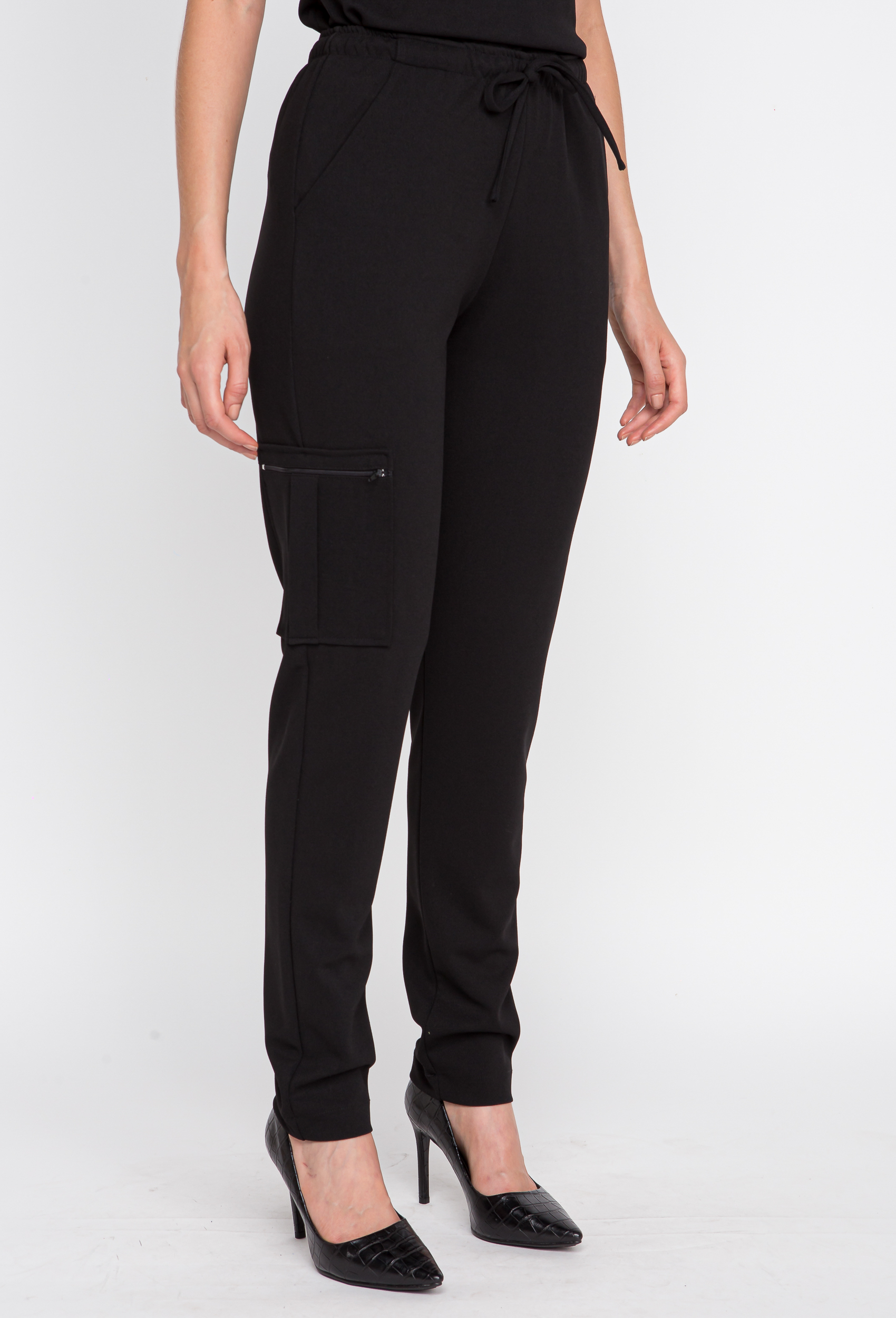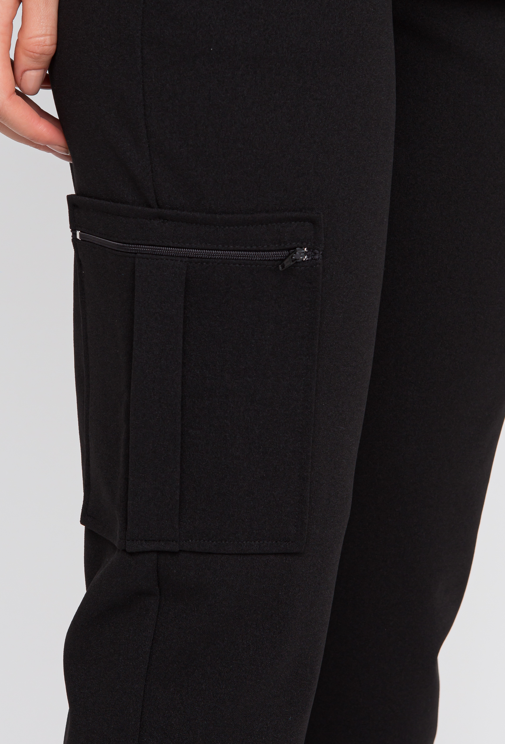 Já a calça é de elástico com cordões, possibilitando assim regular a cintura. Possui bolso sobreposto com zíper na perna e bolsos faca nas laterais.