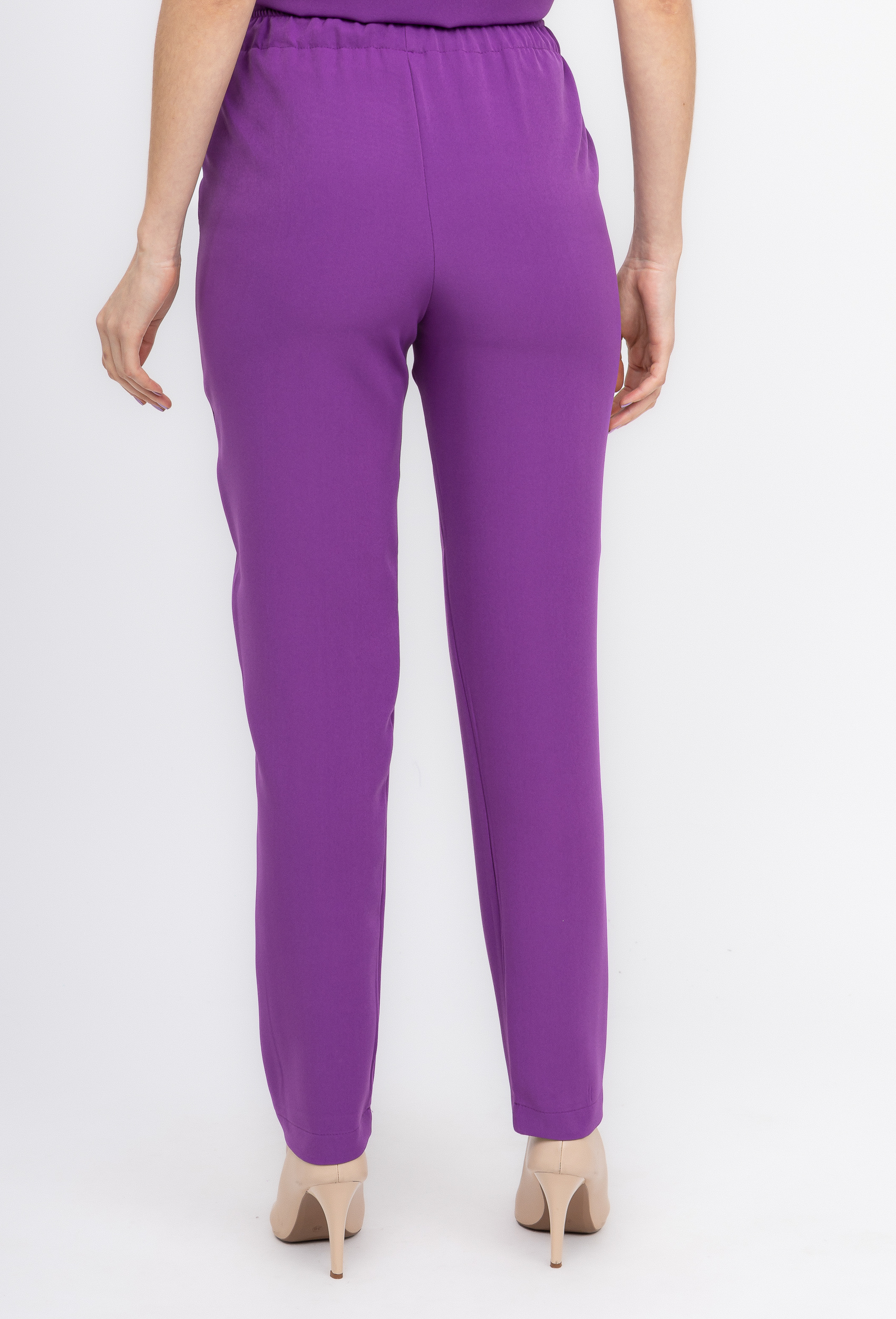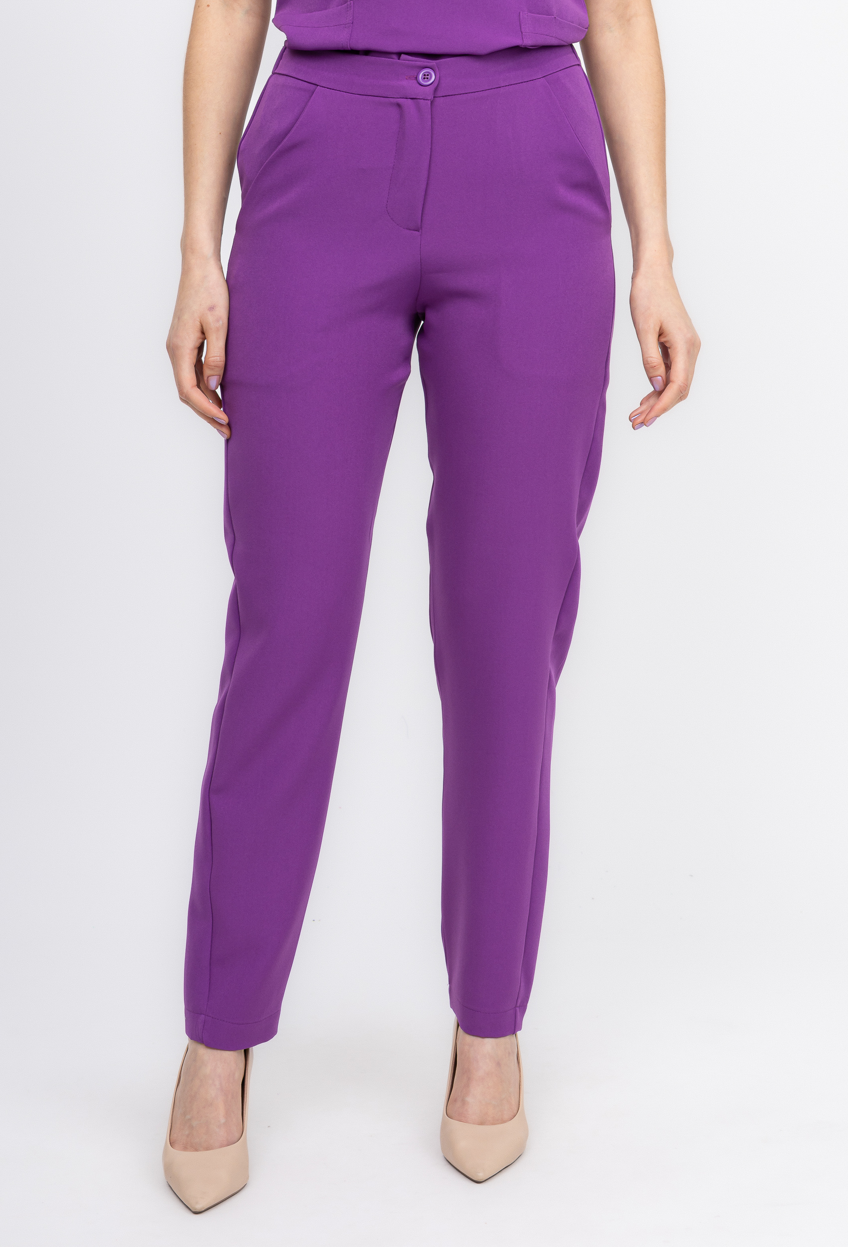 Na calça possui um bolso de cada lado, e na cintura possui cós com botão e zíper na frente. Já na parte traseira possui um elástico que possibilita regular a cintura.