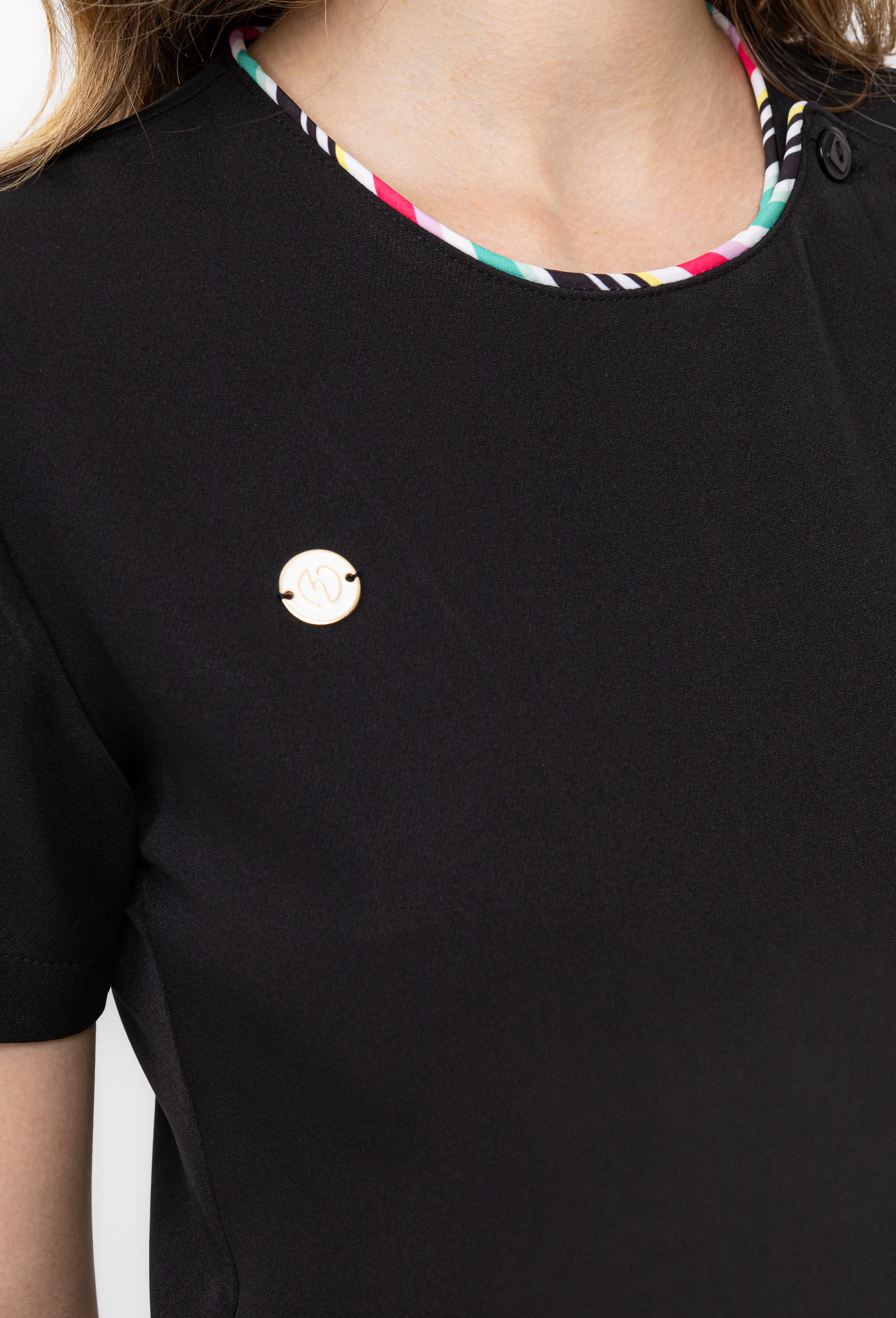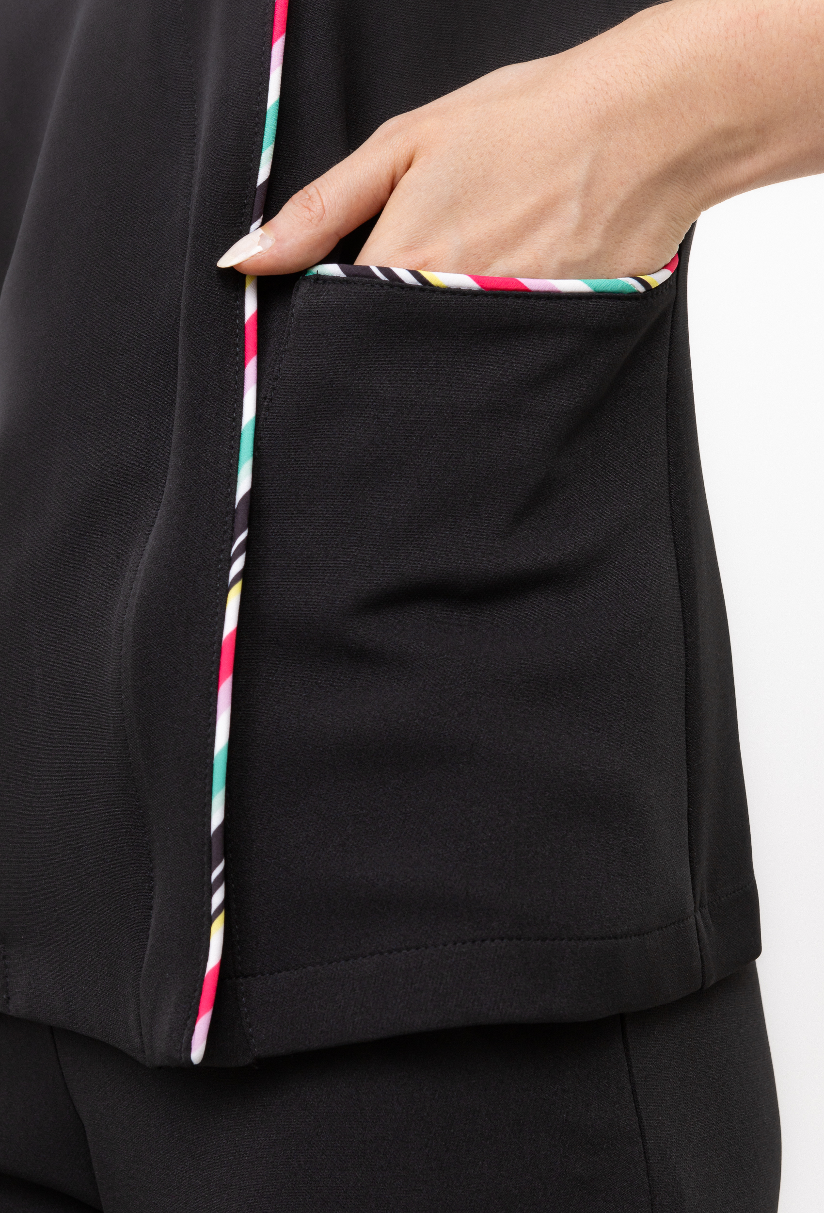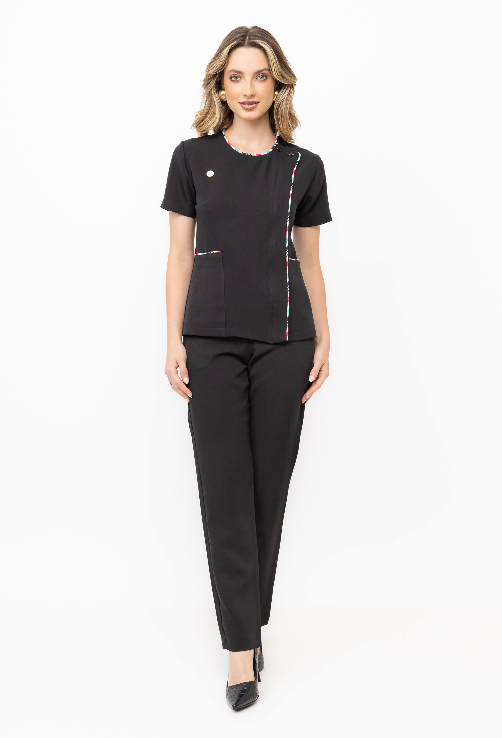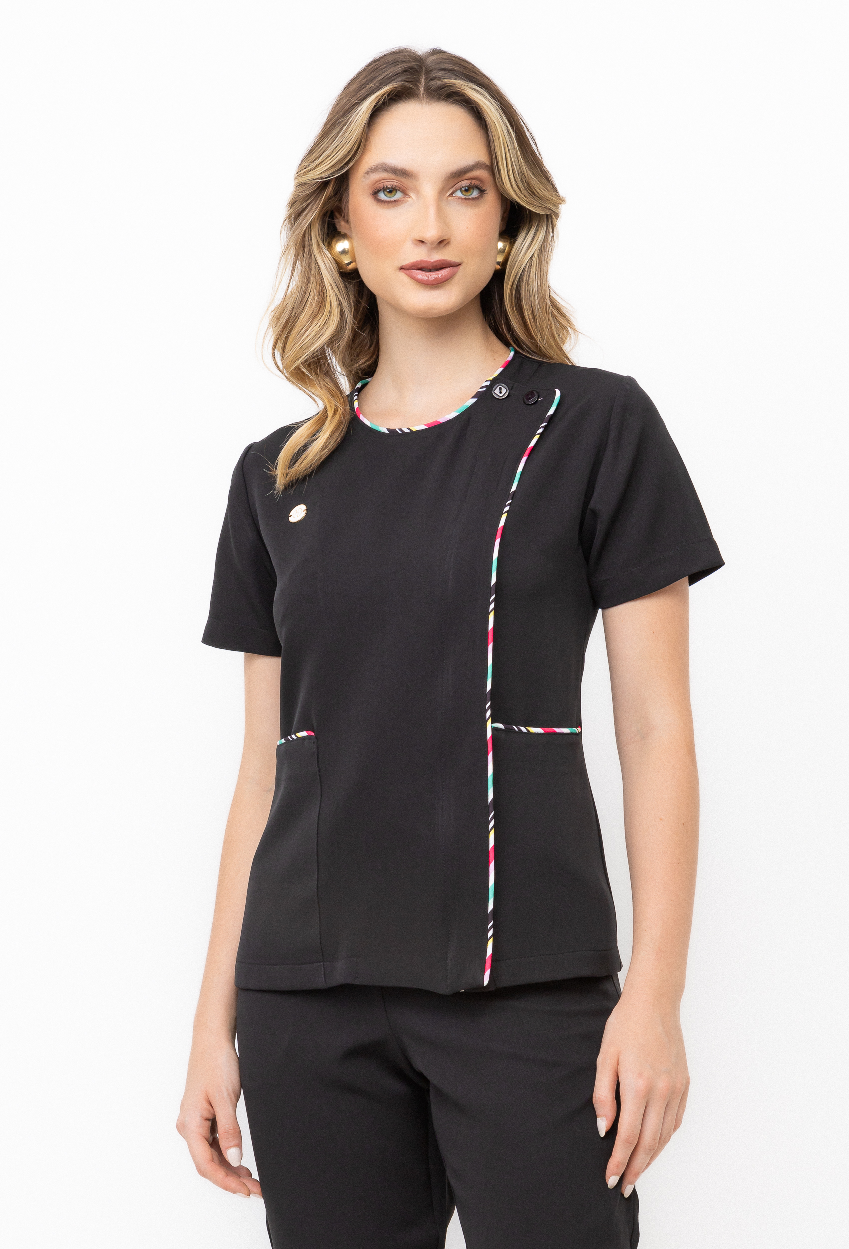 Nosso mais novo modelo scrub zíper cord transpassado prime é um modelo elegante, possuindo na blusa fecho coberto em zíper com viéis colorido nas bordas e nos bolsos. A gola arredondada também com viéis, e com botões na parte do ombro.