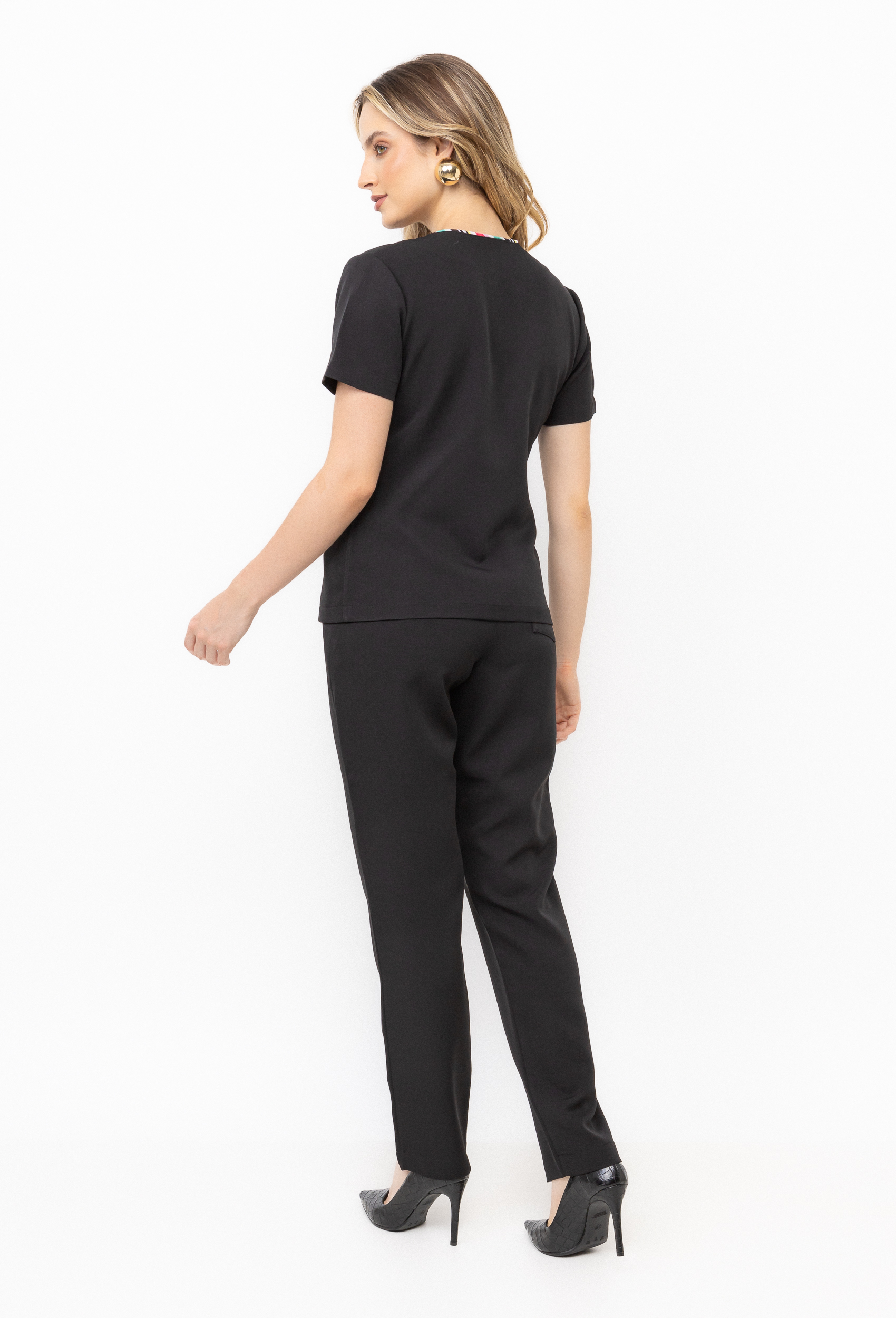 Confeccionado com tecido alfaiataria prime, com a composição de 95% poliester e 5% elastano. Um modelo que contém um toque bem agradável, macio e confortável.